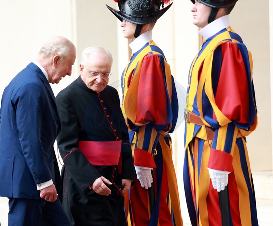 October 23, 2025, Vatican City. San Damaso Courtyard. Arrival of King Charles III of England with Queen Camilla for the meeting with the Pope. Pictured: King Charles III of England with Queen Camilla welcomed by Monsignor Leonardo Sapienza and the gentlemen of His Holiness., Credit:Maria Laura Antonelli / Avalon