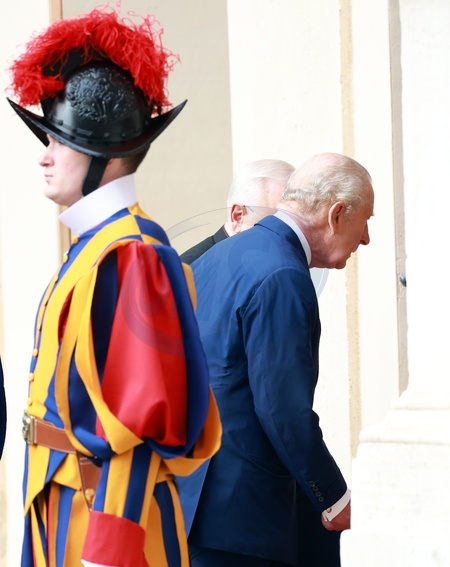 October 23, 2025, Vatican City. San Damaso Courtyard. Arrival of King Charles III of England with Queen Camilla for the meeting with the Pope. Pictured: King Charles III of England with Queen Camilla welcomed by Monsignor Leonardo Sapienza and the gentlemen of His Holiness., Credit:Maria Laura Antonelli / Avalon