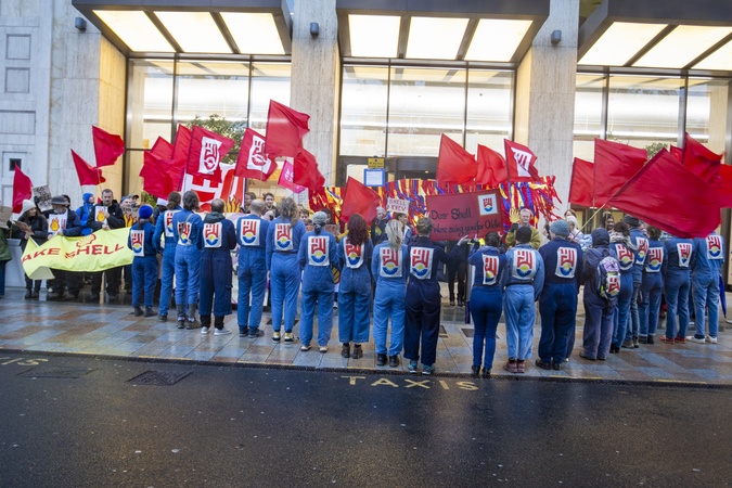 Environmental and climate justice activists gathered outside Shell's Global Headquarters in Central London ahead of the company's upcoming "Profits Day.” Demonstrators called on Shell to pay reparations to survivors of Typhoon Odette in the Philippines, accusing the oil giant of profiting from climate destruction. Protesters held banners and placards demanding accountability from major polluters., Credit:Zak Irfan / Avalon