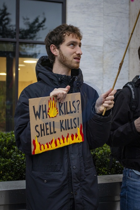 Environmental and climate justice activists gathered outside Shell's Global Headquarters in Central London ahead of the company's upcoming "Profits Day.” Demonstrators called on Shell to pay reparations to survivors of Typhoon Odette in the Philippines, accusing the oil giant of profiting from climate destruction. Protesters held banners and placards demanding accountability from major polluters., Credit:Zak Irfan / Avalon