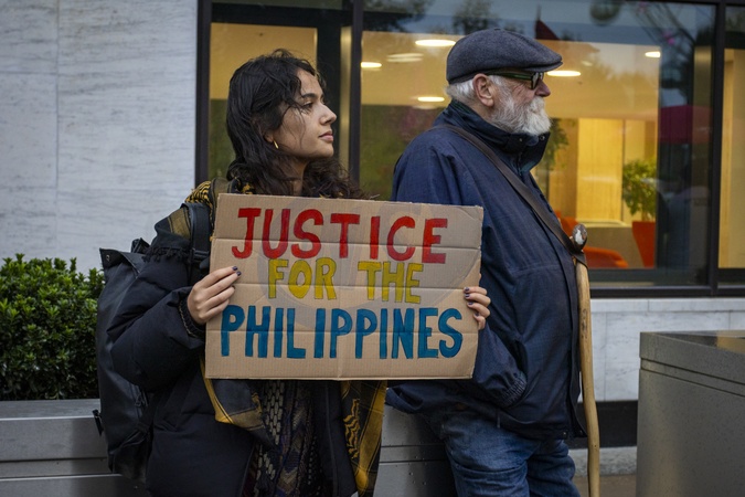 Environmental and climate justice activists gathered outside Shell's Global Headquarters in Central London ahead of the company's upcoming "Profits Day.” Demonstrators called on Shell to pay reparations to survivors of Typhoon Odette in the Philippines, accusing the oil giant of profiting from climate destruction. Protesters held banners and placards demanding accountability from major polluters., Credit:Zak Irfan / Avalon