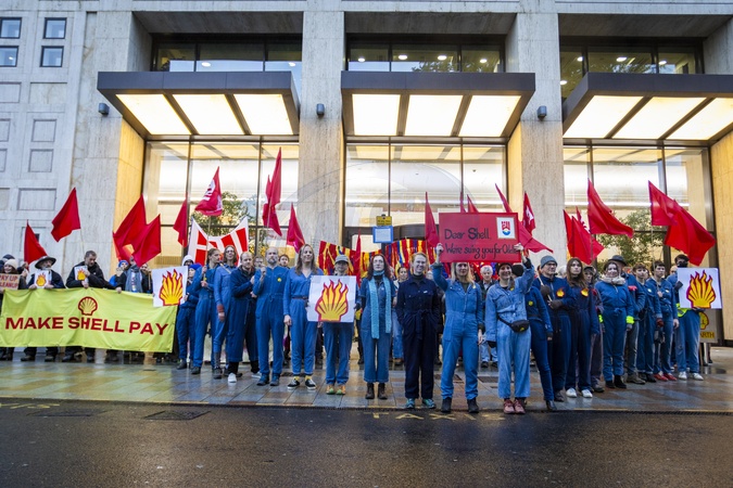 Environmental and climate justice activists gathered outside Shell's Global Headquarters in Central London ahead of the company's upcoming "Profits Day.” Demonstrators called on Shell to pay reparations to survivors of Typhoon Odette in the Philippines, accusing the oil giant of profiting from climate destruction. Protesters held banners and placards demanding accountability from major polluters., Credit:Zak Irfan / Avalon