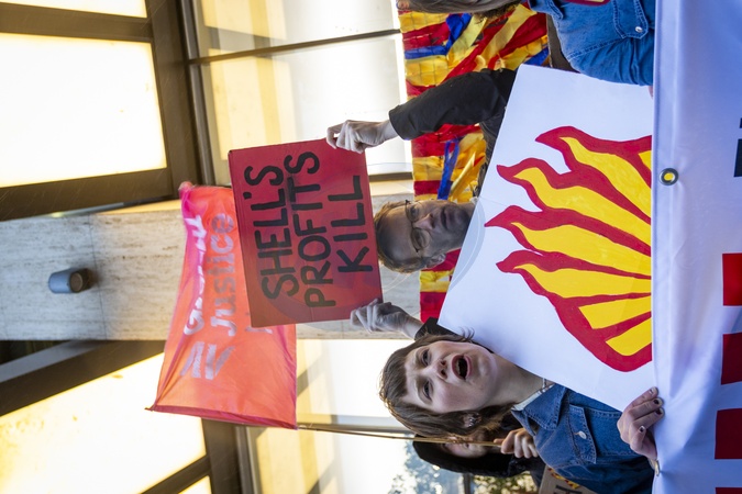Environmental and climate justice activists gathered outside Shell's Global Headquarters in Central London ahead of the company's upcoming "Profits Day.” Demonstrators called on Shell to pay reparations to survivors of Typhoon Odette in the Philippines, accusing the oil giant of profiting from climate destruction. Protesters held banners and placards demanding accountability from major polluters., Credit:Zak Irfan / Avalon