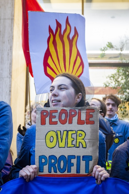 Environmental and climate justice activists gathered outside Shell's Global Headquarters in Central London ahead of the company's upcoming "Profits Day.” Demonstrators called on Shell to pay reparations to survivors of Typhoon Odette in the Philippines, accusing the oil giant of profiting from climate destruction. Protesters held banners and placards demanding accountability from major polluters., Credit:Zak Irfan / Avalon