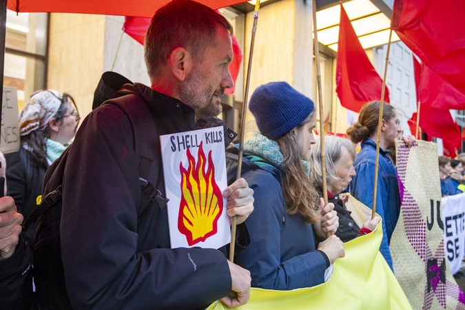 Environmental and climate justice activists gathered outside Shell's Global Headquarters in Central London ahead of the company's upcoming "Profits Day.” Demonstrators called on Shell to pay reparations to survivors of Typhoon Odette in the Philippines, accusing the oil giant of profiting from climate destruction. Protesters held banners and placards demanding accountability from major polluters., Credit:Zak Irfan / Avalon