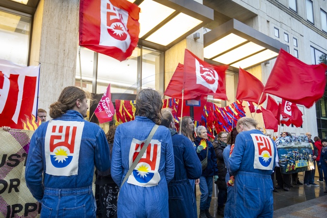 Environmental and climate justice activists gathered outside Shell's Global Headquarters in Central London ahead of the company's upcoming "Profits Day.” Demonstrators called on Shell to pay reparations to survivors of Typhoon Odette in the Philippines, accusing the oil giant of profiting from climate destruction. Protesters held banners and placards demanding accountability from major polluters., Credit:Zak Irfan / Avalon