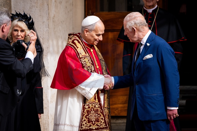 Pope Leo XIV greets Britain's King Charles III and Queen Camilla in the St. Damasus Courtyard after a state visit and prayer with him in the Sistine Chapel in Vatican City, Vatican, on 23 October 2025., Credit:Stefano Costantino TTL / Avalon