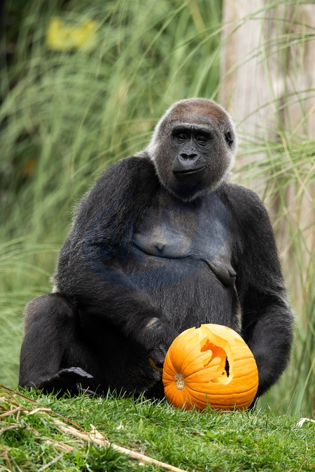 Effie, a Western lowland gorilla at London Zoo enjoys a Halloween pumpkin on 22nd October 2025 in London, England ahead of London Zoo's Boo at the Zoo celebrations this half term., Credit:Tim Whitby / Avalon