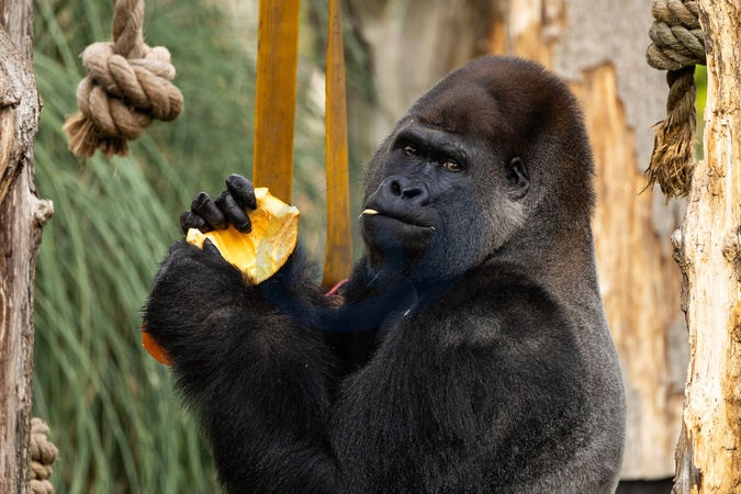 Kiburi, a Western lowland gorilla at London Zoo enjoys a Halloween pumpkin on 22nd October 2025 in London, England ahead of London Zoo's Boo at the Zoo celebrations this half term., Credit:Tim Whitby / Avalon