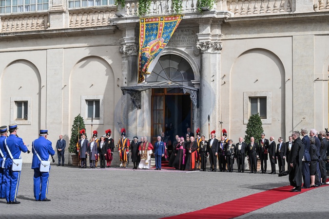 Pope Leo XIV and Queen Camilla exit the Apostolic Palace, and in the San Damaso Courtyard will bid farewell to the Regent of the Prefecture of the Papal Household, Reverend Monsignor Leonardo Sapienza; the Vatican City Head of Protocol, Monsignor Javier Domingo Fernandez Gonzalez and Deputy Head of Protocol, Monsignor Lins. Their Majesties will stand as the British and Vatican national anthems play, before departing in the State Bentley. Vatican City 23 Oct 2025, Credit:Maria Laura Antonelli / Avalon