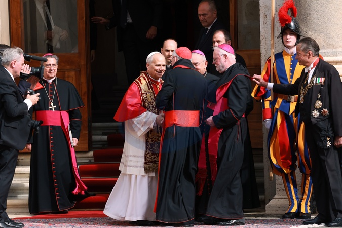 Pope Leo XIV and Queen Camilla exit the Apostolic Palace, and in the San Damaso Courtyard will bid farewell to the Regent of the Prefecture of the Papal Household, Reverend Monsignor Leonardo Sapienza; the Vatican City Head of Protocol, Monsignor Javier Domingo Fernandez Gonzalez and Deputy Head of Protocol, Monsignor Lins. Their Majesties will stand as the British and Vatican national anthems play, before departing in the State Bentley. Vatican City 23 Oct 2025, Credit:Maria Laura Antonelli / Avalon