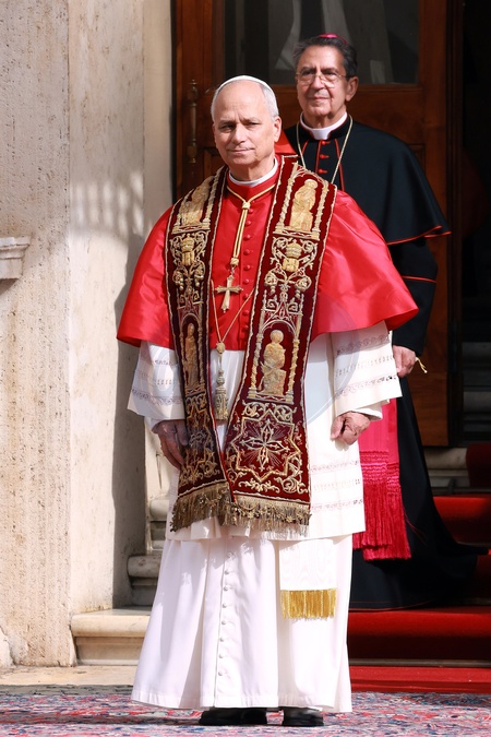 Pope Leo XIV and Queen Camilla exit the Apostolic Palace, and in the San Damaso Courtyard will bid farewell to the Regent of the Prefecture of the Papal Household, Reverend Monsignor Leonardo Sapienza; the Vatican City Head of Protocol, Monsignor Javier Domingo Fernandez Gonzalez and Deputy Head of Protocol, Monsignor Lins. Their Majesties will stand as the British and Vatican national anthems play, before departing in the State Bentley. Vatican City 23 Oct 2025, Credit:Maria Laura Antonelli / Avalon