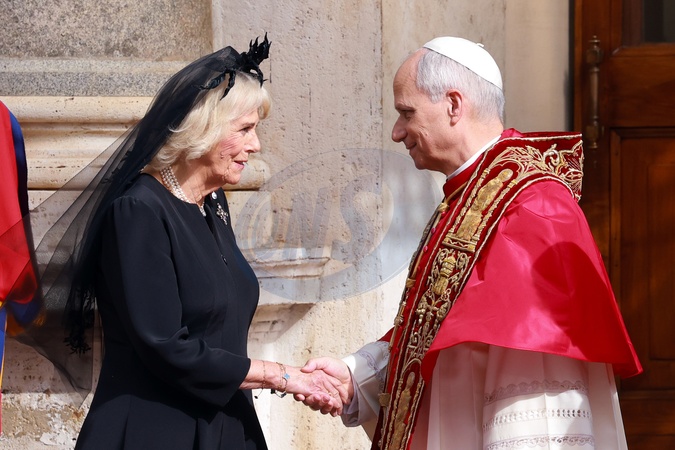 Pope Leo XIV and Queen Camilla exit the Apostolic Palace, and in the San Damaso Courtyard will bid farewell to the Regent of the Prefecture of the Papal Household, Reverend Monsignor Leonardo Sapienza; the Vatican City Head of Protocol, Monsignor Javier Domingo Fernandez Gonzalez and Deputy Head of Protocol, Monsignor Lins. Their Majesties will stand as the British and Vatican national anthems play, before departing in the State Bentley. Vatican City 23 Oct 2025, Credit:Maria Laura Antonelli / Avalon