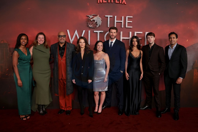 Renate Radford, Laurence Fishburne, Freya Allan, Lauren Schmidt Hissrich, Liam Hemsworth, Anya Chalotra, Joey Batey and Rahul Bansal at The Witcher season 4 global premiere, Curzon Mayfair cinema,London, UK on 23rd October 2025, Credit:James Shaw / Avalon