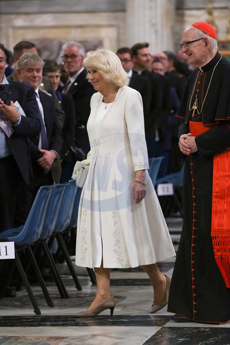 King Charles III and Queen Camilla visit the Papal Basilica and Abbey of St. Paul's Outside the Walls to attend an ecumenical service in recognition of His Majesty becoming 'Royal Confrater' of the Abbey of St Paul's. The Children of the Choir of His Majesty's Chapel Royal and the Choir of St. George's Chapel, Windsor, will perform. Rome, Italy 23 Oct 2025 *** Local Caption *** ROME, I - OCTOBER 23: King Charles III and Queen Camilla leave St. Paul Basilica after an ecumenical Service of Prayer on October 23, 2025 in Rome, Italy. During this historic State Visit, King Charles III and Queen Camilla will meet Pope Leo XIV for the first time since he was elected in May 2025. The King and Queen will join the Catholic Church's 2025 Jubilee Year celebrations, during which the heads of the Catholic Church and Church of England will pray together, the first time the British monarch and pontiff have done so at a church service since the English Reformation. (Photo by Franco Origlia/Getty Images), Credit:Franco Origlia / Avalon