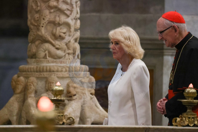 King Charles III and Queen Camilla visit the Papal Basilica and Abbey of St. Paul's Outside the Walls to attend an ecumenical service in recognition of His Majesty becoming 'Royal Confrater' of the Abbey of St Paul's. The Children of the Choir of His Majesty's Chapel Royal and the Choir of St. George's Chapel, Windsor, will perform. Rome, Italy 23 Oct 2025 *** Local Caption *** ROME, I - OCTOBER 23: King Charles III and Queen Camilla leave St. Paul Basilica after an ecumenical Service of Prayer on October 23, 2025 in Rome, Italy. During this historic State Visit, King Charles III and Queen Camilla will meet Pope Leo XIV for the first time since he was elected in May 2025. The King and Queen will join the Catholic Church's 2025 Jubilee Year celebrations, during which the heads of the Catholic Church and Church of England will pray together, the first time the British monarch and pontiff have done so at a church service since the English Reformation. (Photo by Franco Origlia/Getty Images), Credit:Franco Origlia / Avalon