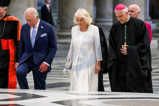 King Charles III and Queen Camilla visit the Papal Basilica and Abbey of St. Paul's Outside the Walls to attend an ecumenical service in recognition of His Majesty becoming 'Royal Confrater' of the Abbey of St Paul's. The Children of the Choir of His Majesty's Chapel Royal and the Choir of St. George's Chapel, Windsor, will perform. Rome, Italy 23 Oct 2025 *** Local Caption *** ROME, I - OCTOBER 23: King Charles III and Queen Camilla leave St. Paul Basilica after an ecumenical Service of Prayer on October 23, 2025 in Rome, Italy. During this historic State Visit, King Charles III and Queen Camilla will meet Pope Leo XIV for the first time since he was elected in May 2025. The King and Queen will join the Catholic Church's 2025 Jubilee Year celebrations, during which the heads of the Catholic Church and Church of England will pray together, the first time the British monarch and pontiff have done so at a church service since the English Reformation. (Photo by Franco Origlia/Getty Images), Credit:Franco Origlia / Avalon