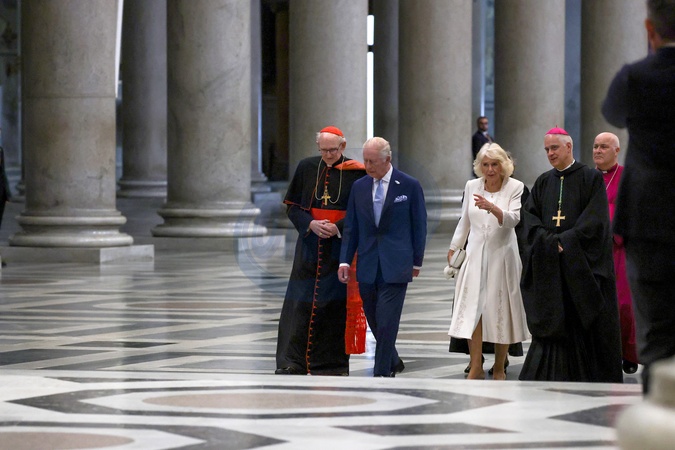 King Charles III and Queen Camilla visit the Papal Basilica and Abbey of St. Paul's Outside the Walls to attend an ecumenical service in recognition of His Majesty becoming 'Royal Confrater' of the Abbey of St Paul's. The Children of the Choir of His Majesty's Chapel Royal and the Choir of St. George's Chapel, Windsor, will perform. Rome, Italy 23 Oct 2025 *** Local Caption *** ROME, ITA - OCTOBER 23: King Charles III and Queen Camilla leave St. Paul Basilica after an ecumenical Service of Prayer on October 23, 2025 in Rome, Italy. During this historic State Visit, King Charles III and Queen Camilla will meet Pope Leo XIV for the first time since he was elected in May 2025. The King and Queen will join the Catholic Church's 2025 Jubilee Year celebrations, during which the heads of the Catholic Church and Church of England will pray together, the first time the British monarch and pontiff have done so at a church service since the English Reformation. (Photo by Franco Origlia/Getty Images), Credit:Franco Origlia / Avalon