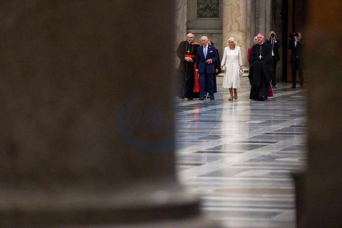 King Charles III and Queen Camilla visit the Papal Basilica and Abbey of St. Paul's Outside the Walls to attend an ecumenical service in recognition of His Majesty becoming 'Royal Confrater' of the Abbey of St Paul's. The Children of the Choir of His Majesty's Chapel Royal and the Choir of St. George's Chapel, Windsor, will perform. Rome, Italy 23 Oct 2025 *** Local Caption *** ROME, ITA - OCTOBER 23: King Charles III and Queen Camilla leave St. Paul Basilica after an ecumenical Service of Prayer on October 23, 2025 in Rome, Italy. During this historic State Visit, King Charles III and Queen Camilla will meet Pope Leo XIV for the first time since he was elected in May 2025. The King and Queen will join the Catholic Church's 2025 Jubilee Year celebrations, during which the heads of the Catholic Church and Church of England will pray together, the first time the British monarch and pontiff have done so at a church service since the English Reformation. (Photo by Franco Origlia/Getty Images), Credit:Franco Origlia / Avalon