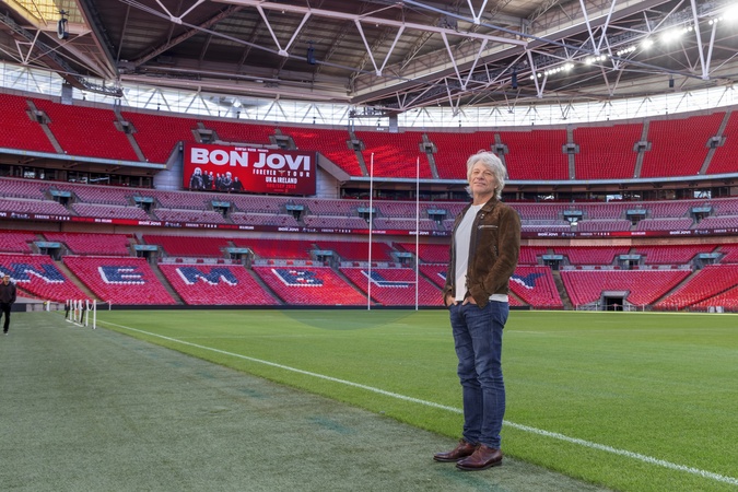 Jon Bon Jovi poses for photos on the pitch after a press conference at Wembley Stadium, in London, UK, on 24th October 2025, Credit:James Shaw / Avalon