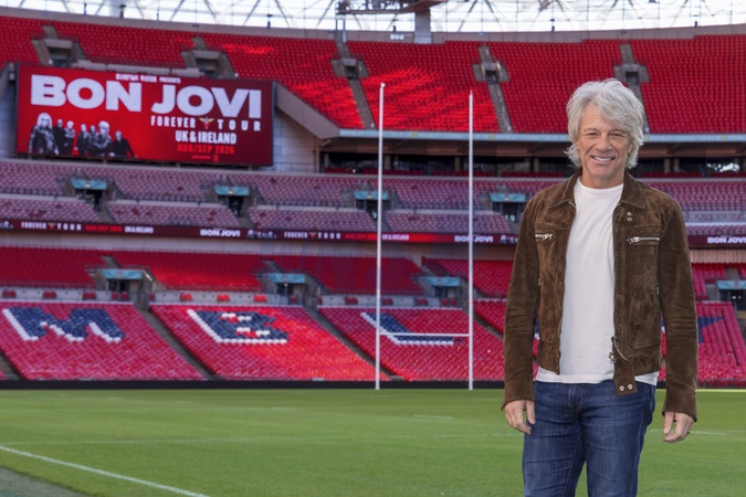 Jon Bon Jovi poses for photos on the pitch after a press conference at Wembley Stadium, in London, UK, on 24th October 2025, Credit:James Shaw / Avalon