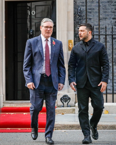 London, UK. 24th Oct 2025. Volodymyr Zelenskyy, President of Ukraine,and Sir Keir Starmer, Prime Minister of the United Kingdom walk from 10 Downing Street to the Foreign Office, where they are greeted by Ukrainian children with flags. Starmer will host Zelenskyy and other leaders for meetings of the 'Coalition of the Willing' at the Foreign Office., Credit:Imageplotter / Avalon