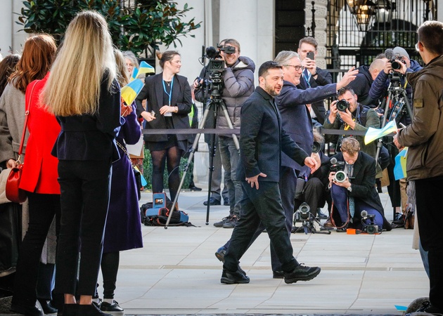 Volodymyr Zelenskyy and Sir Keir Starmer walk to the Foreign Office, greeted by Ukrainian childrenDowning Street, London, UK