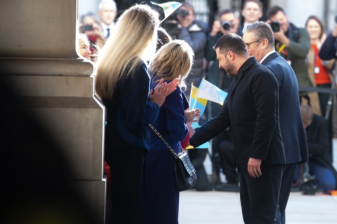 British Prime Minister Sir Keir Starmer and Ukrainian President Volodymyr Zelenskyy are greeted by children as they arrive in the Foreign, Commonwealth and Development Office (FCDO) after departing Downing Street, London, England, UK on Friday 24 October, 2025., Credit:Justin Ng / Avalon