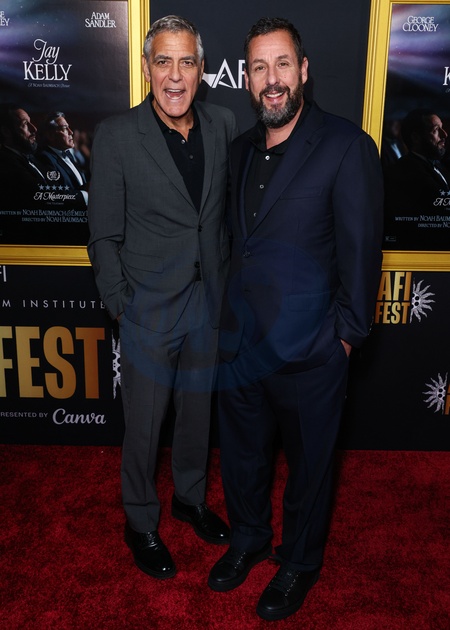 HOLLYWOOD, LOS ANGELES, CALIFORNIA, USA - OCTOBER 23: American actor, filmmaker, activist, and humanitarian George Clooney and American actor and comedian Adam Sandler arrive at the 2025 AFI (American Film Institute) Fest Presented By Canva - Premiere Of Netflix's 'Jay Kelly' held at the TCL Chinese Theatre IMAX on October 23, 2025 in Hollywood, Los Angeles, California, United States., Credit:Xavier Collin / Avalon