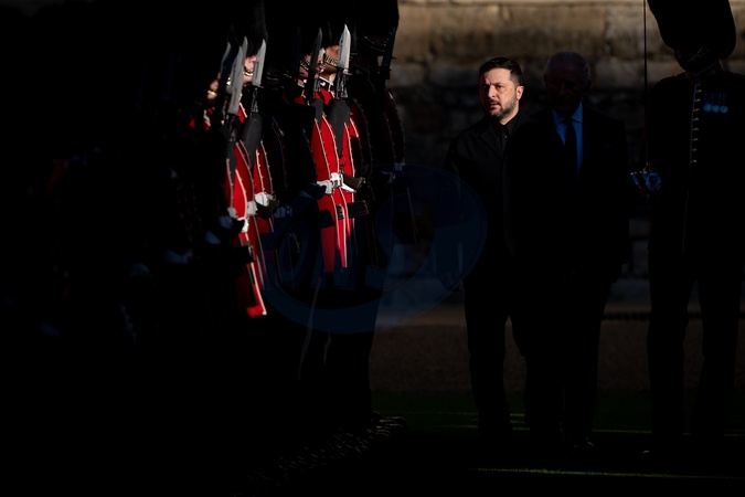 Ukrainian President Volodymyr Zelensky, King Charles III and Major Ben Tracey inspecting a guard of honour at Windsor Castle, Berkshire. Picture date: Friday October 24, 2025., Credit:Aaron Chown / Avalon