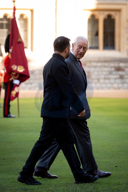 Ukrainian President Volodymyr Zelensky and King Charles III after inspecting a guard of honour at Windsor Castle, Berkshire. Picture date: Friday October 24, 2025., Credit:Aaron Chown / Avalon