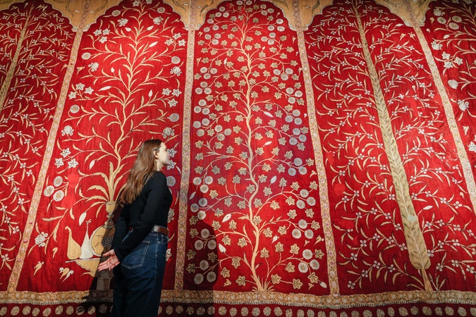 London, UK. 24th Oct 2025. Staff with 'A large and impressive Cotton Tent Wall (qanat)', probably from Jaipur, Rajastan, probably 19th ct. Estimate: £150,000-250,000. Christie's Art of the Islamic and Indian Worlds photocall., Credit:Imageplotter / Avalon