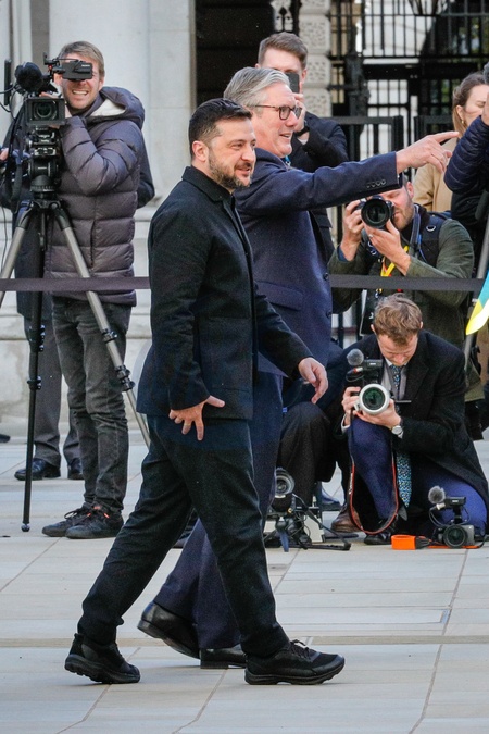 Volodymyr Zelenskyy and Sir Keir Starmer walk to the Foreign Office, greeted by Ukrainian childrenDowning Street, London, UK
