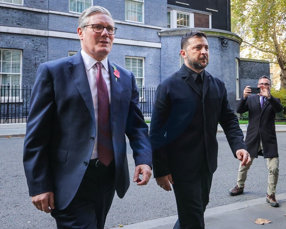 London, UK. 24th Oct 2025. Volodymyr Zelenskyy, President of Ukraine,and Sir Keir Starmer, Prime Minister of the United Kingdom walk from 10 Downing Street to the Foreign Office, where they are greeted by Ukrainian children with flags. Starmer will host Zelenskyy and other leaders for meetings of the 'Coalition of the Willing' at the Foreign Office., Credit:Imageplotter / Avalon
