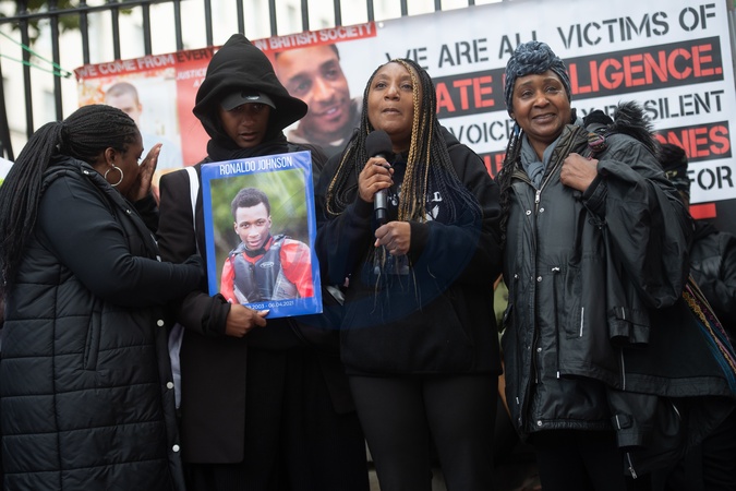 Lorraine Dias - mother of Ronaldo Johnson (who died following a police pursuit in Manchester in 2021) from The United Friends and Family Campaign speak outside of Downing Street, London, England, UK on Saturday 25 October, 2025 as part of an Annual Memorial Procession., Credit:Justin Ng / Avalon