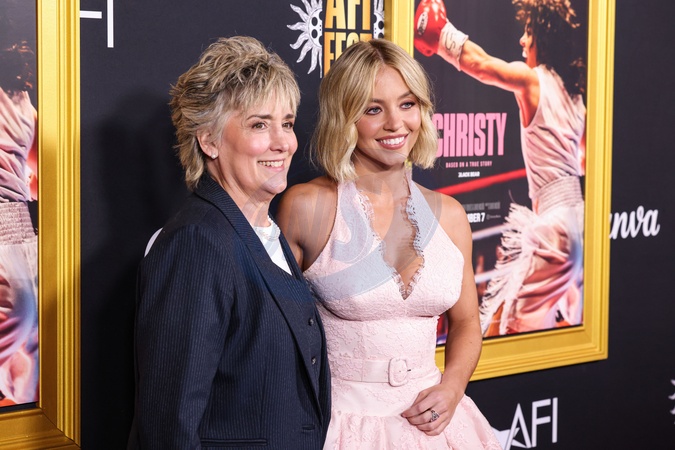 HOLLYWOOD, LOS ANGELES, CALIFORNIA, USA - OCTOBER 25: American former professional boxer, boxing analyst and motivational speaker Christy Martin and American actress and producer Sydney Sweeney wearing a custom Miu Miu dress arrive at the 2025 AFI (American Film Institute) Fest Presented By Canva - Premiere Of Black Bear's 'Christy' held at the TCL Chinese Theatre IMAX on October 25, 2025 in Hollywood, Los Angeles, California, United States., Credit:Xavier Collin / Avalon