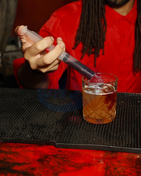 The Devour Sour with Wild Turkey 81, Disaronno, lemon, sugar, red wine, vegan foamer at Purgatory Bar in Pimlico, London, Credit:Mario Mitsis / Avalon