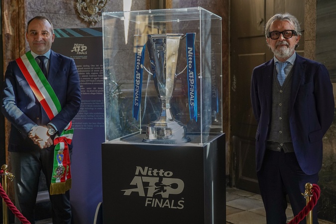October 27, 2025, Turin, City Hall. The Nitto ATP Final trophy stops at the city hall. Pictured next to the trophy are Mayor Stefano Lorusso and Sports Councilor Domenico Carretta., Credit:Selene Daniele / Avalon