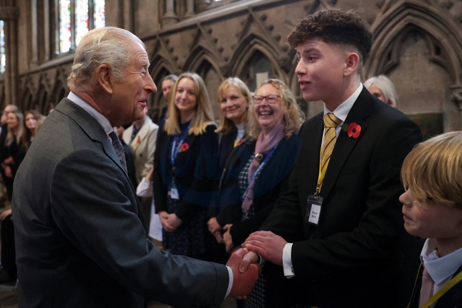 Britain's King Charles shakes hands with a youngster during his visit to Lichfield Cathedral, with a focus on the Fenland Black Oak Table, The Table for the Nation, in Lichfield, Staffordshire, Britain, October 27, 2025. REUTERS/Temilade, Credit:Temilade Adelaja / Avalon