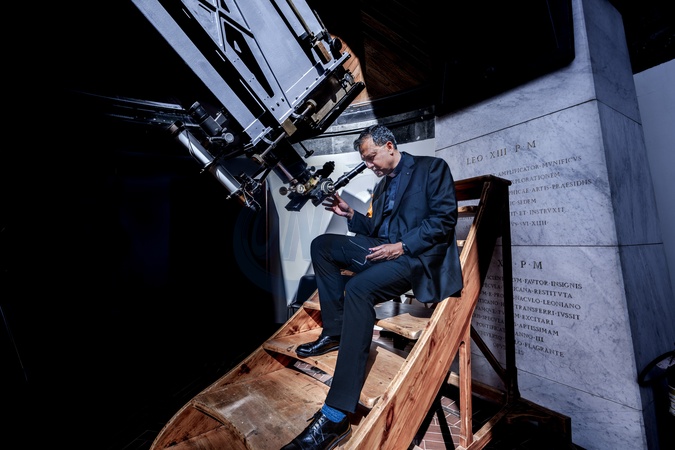 08/09/25 Albano Laziale, Vatican Observatory. Pictured is the director of the Observatory, Father Richard Anthony D'Souza, during a maintenance check on an old telescope in the observatory's dome. The first Indian director of the Vatican Observatory, the Pope's astronomical observatory in Castel Gandolfo, led over time by Italian, Spanish, Northern European, and Anglo-Saxon astronomers. Father Richard Anthony D'Souza, born in 1978, is a Jesuit like Pope Francis. The Pope's astronomer believes that Leo XIV, the mathematician pontiff, is interested in how the results of science "can be used to help everyone.", Credit:Luigi Narici / Avalon