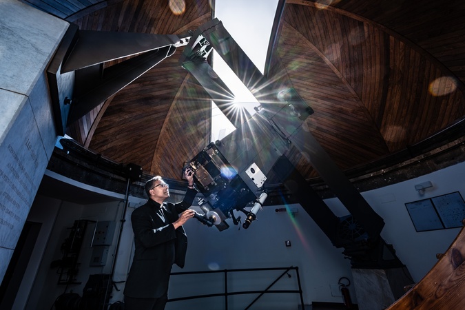 08/09/25 Albano Laziale, Vatican Observatory. Pictured is the director of the Observatory, Father Richard Anthony D'Souza, during a maintenance check on an old telescope in the observatory's dome. The first Indian director of the Vatican Observatory, the Pope's astronomical observatory in Castel Gandolfo, led over time by Italian, Spanish, Northern European, and Anglo-Saxon astronomers. Father Richard Anthony D'Souza, born in 1978, is a Jesuit like Pope Francis. The Pope's astronomer believes that Leo XIV, the mathematician pontiff, is interested in how the results of science "can be used to help everyone.", Credit:Luigi Narici / Avalon