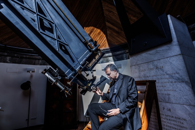 08/09/25 Albano Laziale, Vatican Observatory. Pictured is the director of the Observatory, Father Richard Anthony D'Souza, during a maintenance check on an old telescope in the observatory's dome. The first Indian director of the Vatican Observatory, the Pope's astronomical observatory in Castel Gandolfo, led over time by Italian, Spanish, Northern European, and Anglo-Saxon astronomers. Father Richard Anthony D'Souza, born in 1978, is a Jesuit like Pope Francis. The Pope's astronomer believes that Leo XIV, the mathematician pontiff, is interested in how the results of science "can be used to help everyone.", Credit:Luigi Narici / Avalon