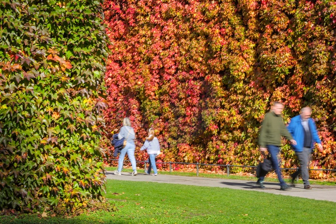London, UK. 28th Oct 2025. People walk and cycle by the vibrantly coloured autumnal virginia creeper (Parthenocissus quinquefolia) growing along the walls of the Admiralty Citadel building at Horse Guards Parade in Westminster, on a day with beautiful sunshine and mild temperatures., Credit:Imageplotter / Avalon