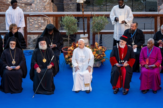 Pope Leo XIV attends an inter-religious meeting to pray for peace inside the Colosseum in Rome, Italy on 28 October 2025.