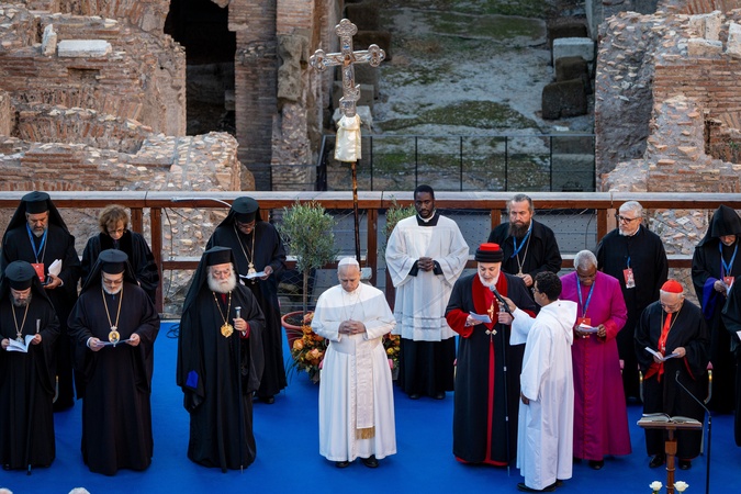 Pope Leo XIV attends an inter-religious meeting to pray for peace inside the Colosseum in Rome, Italy on 28 October 2025.