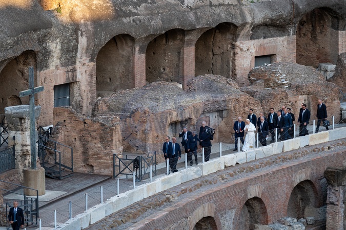 Pope Leo XIV attends an inter-religious meeting to pray for peace inside the Colosseum in Rome, Italy on 28 October 2025.