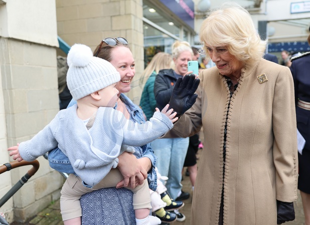 CORSHAM, ENGLAND - OCTOBER 28: Queen Camilla meets a young well-wisher ahead of her visit to The Poppy Project on October 28, 2025 in Corsham, England. The Poppy Project has resulted in a display of crocheted and knitted poppies, which commemorates the 80th anniversary of the end of World War II., Credit:Chris Jackson / Avalon