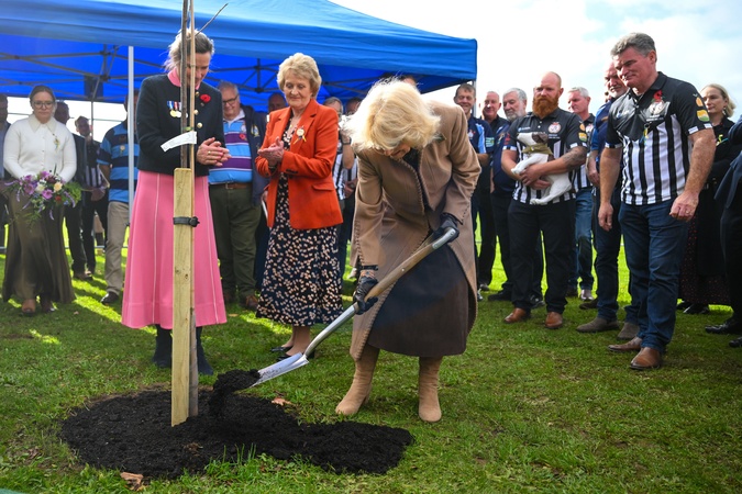 BROMHAM, ENGLAND - OCTOBER 28: Queen Camilla plants a tree in memory of Craig Dalby, an ex close protection officer, during her visit to Bromham Community Hub on October 28, 2025 in Bromham, England. The hub aims to reduce isolation and support mental health by providing a flexible community space for village residents., Credit:Finnbarr Webster / Avalon