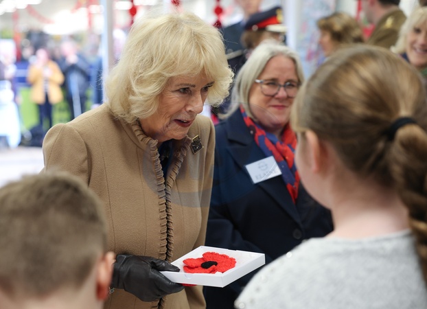 CORSHAM, ENGLAND - OCTOBER 28: Queen Camilla visits the poppy workshop at Martingate Shopping Centre where she met those involved in making the poppies and observed a demonstration of how they have been created during her visit to The Poppy Project on October 28, 2025 in Corsham, England. The Poppy Project has resulted in a display of crocheted and knitted poppies, which commemorates the 80th anniversary of the end of World War II., Credit:Chris Jackson / Avalon