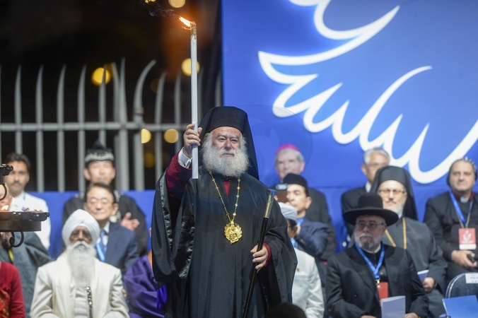 Italy, Rome, Colosseum, 28 October, 2025: Closing ceremony of the 'Dare for Peace' event organized by the Community of Sant'Egidio. In the photo the Greek Orthodox Patriarch of Jerusalem Theophilos III with the torch of peace, Credit:Stefano Carofei / Avalon